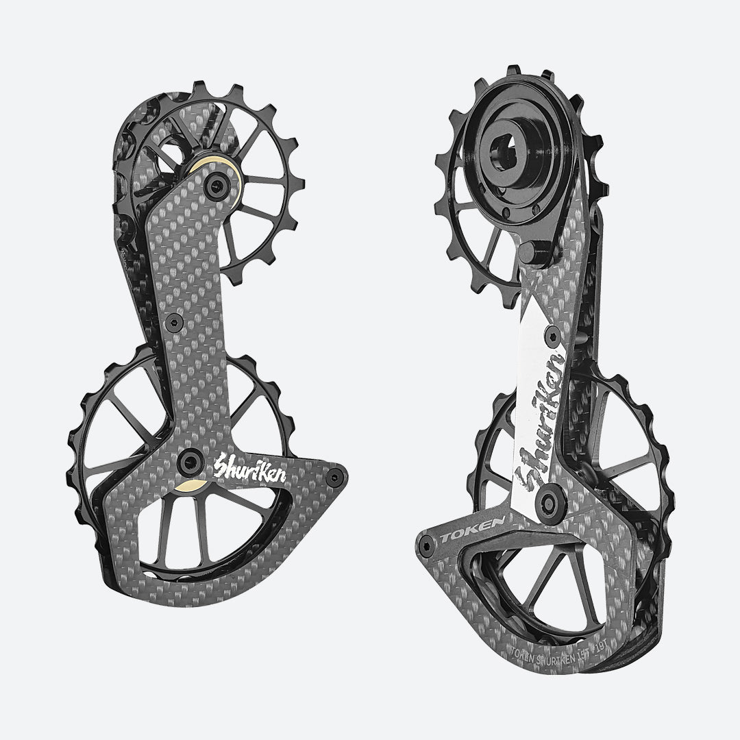 The Shuriken oversized pulley system was engineered for maximum performance and designed to enhance drivetrain efficiency on any bike. The larger pulley diameter enables the system to rotate at lower RPMs, reducing the chain's articulation angle and subsequently minimizing drivetrain friction. The TBT bearings within the pulleys are filled with specially developed light grease to keep drag low and minimize resistance. The combination of a carbon fiber cage and hardened steel/dura-aluminum hardware establishes a lightweight yet robust foundation for the system.