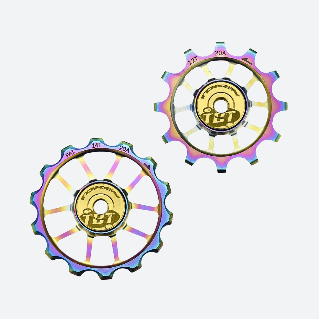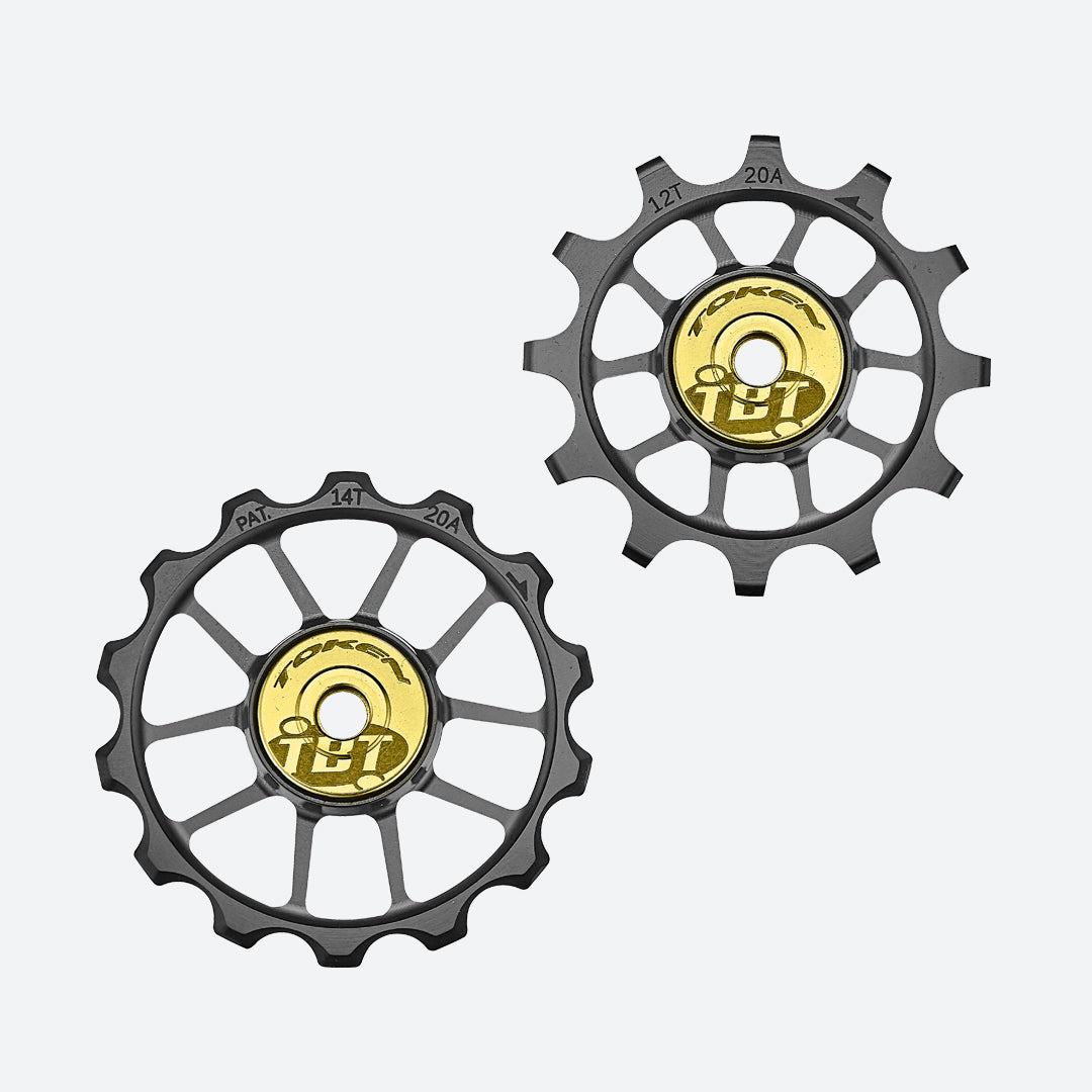 La poulie supérieure, plus haute et carrée, favorise un mouvement de chaîne plus dynamique. Fabriquées en dura-aluminium et revêtues de PVD (dépôt physique en phase vapeur), elles offrent une faible friction durable et une esthétique soignée. Un profil de denture spécifique assure des changements de vitesse précis et un fonctionnement ultra-souple.